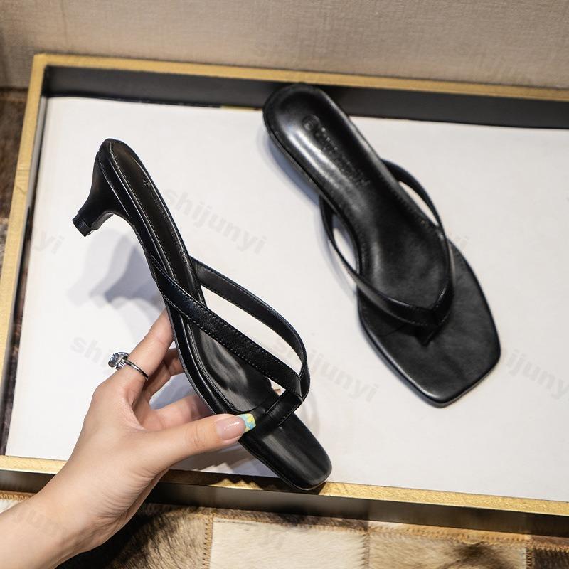 Mode Cuir Véritable Femmes Sandales à Clips Bout Carré 2025 Été Nouveaux Tongs à Talons Hauts Chaussons d'Extérieur en Cuir Véritable pour Femmes cm k