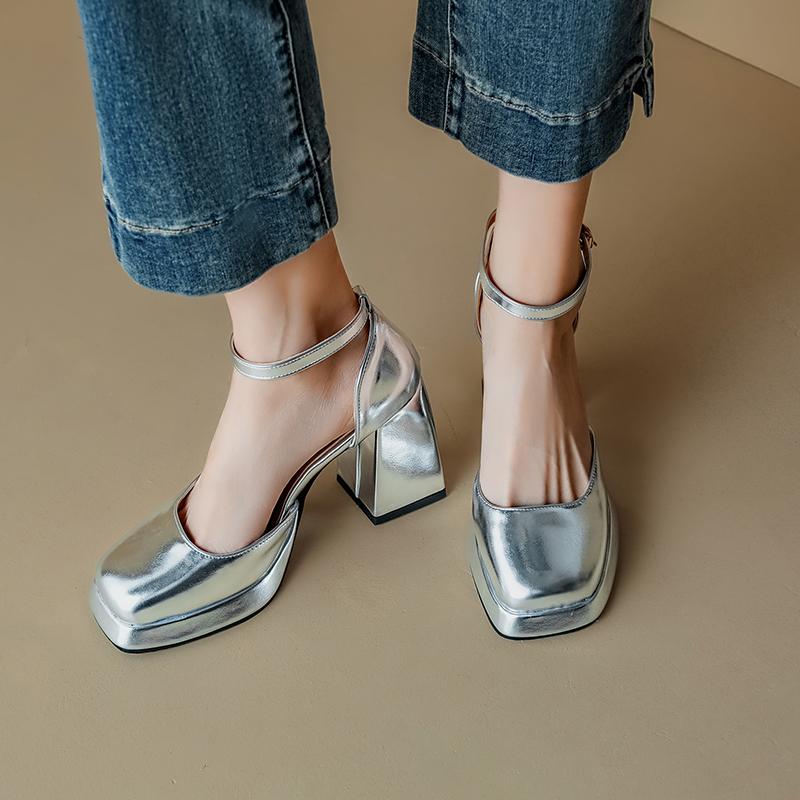 Fashion Women Platform Sandals Shiny Silver Gold High Block Heels Office Party Dress Ladies Summer Square Toe Ankle Strap Shoes cm silver