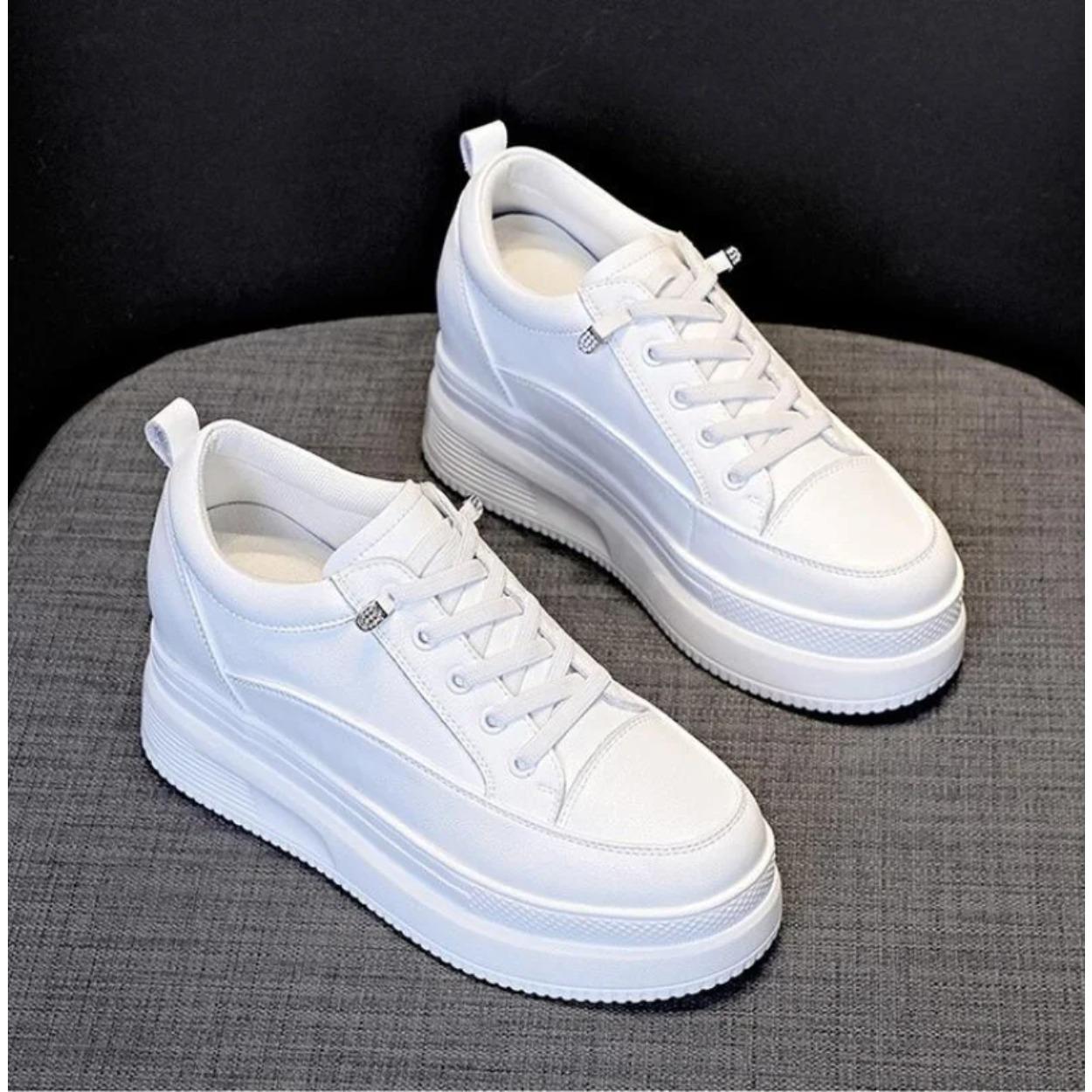 Høst Ekte Skinn Dame Fritidssko Supertykk 8CM Plattform Kile Dame Mote Sneakers Chunky Sko Sommer Skateboard cm Hvit