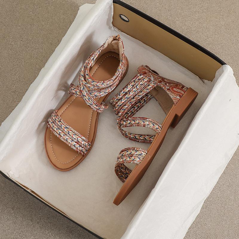 Tissu imprimé mode sandales bohèmes femmes talon couvert zip ouvert ethnique sadnalias mujer cheville sangle plates sandales femmes été taille 42 cm m