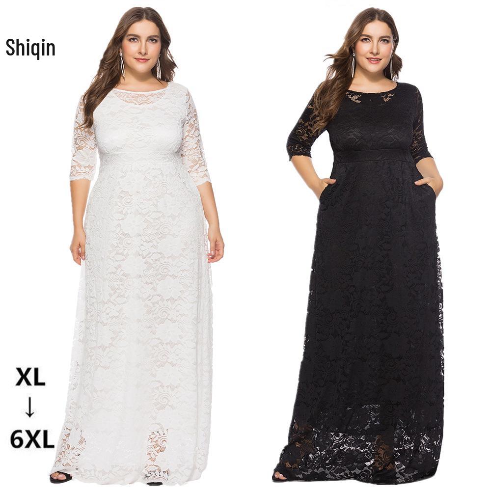 Plus Size Women's Autumn Evening Long Dress with Lace and Pockets cm white