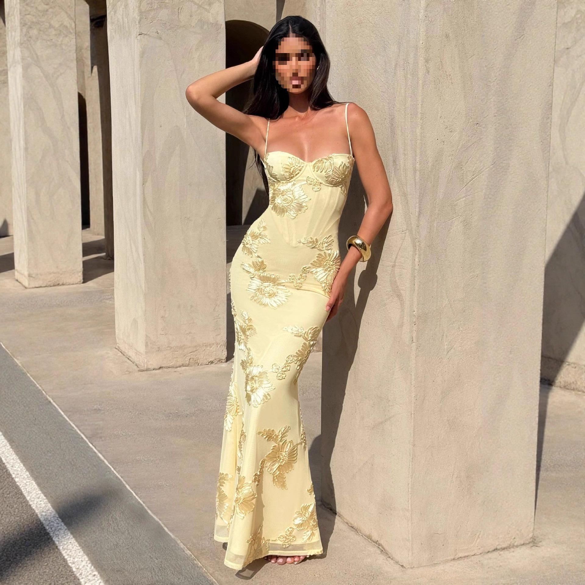 Rygglös aftonklänning med blomsterprydnad och tunna axelband cm citrongul färg