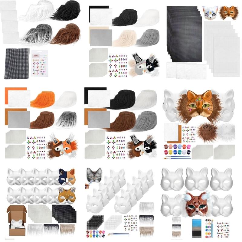 Therians Maskerset Furs,Eye Mesh,Vilten Vel DIY Vossen Katten Masker om te Schilderen Furry Dierenmasker Uitrusting voor Halloween Cosplay