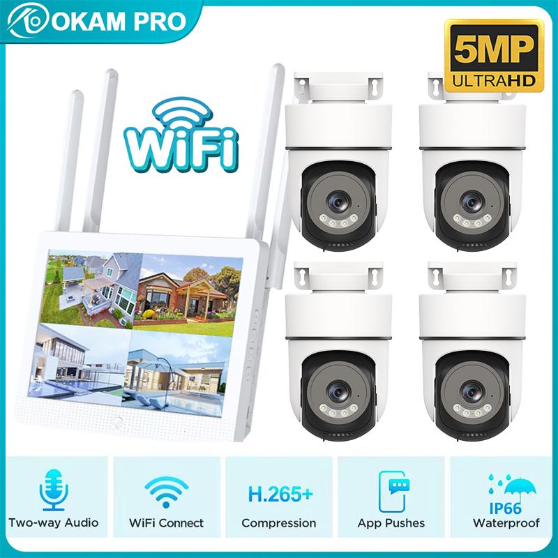 OKAM PRO 10,1 inch Scherm Beeldscherm Beveiligingscamera Kit 4 STuks HD 5MP WiFi Camera Kit Tweerichtingsintercom Nachtzicht PTZ IP CCTV