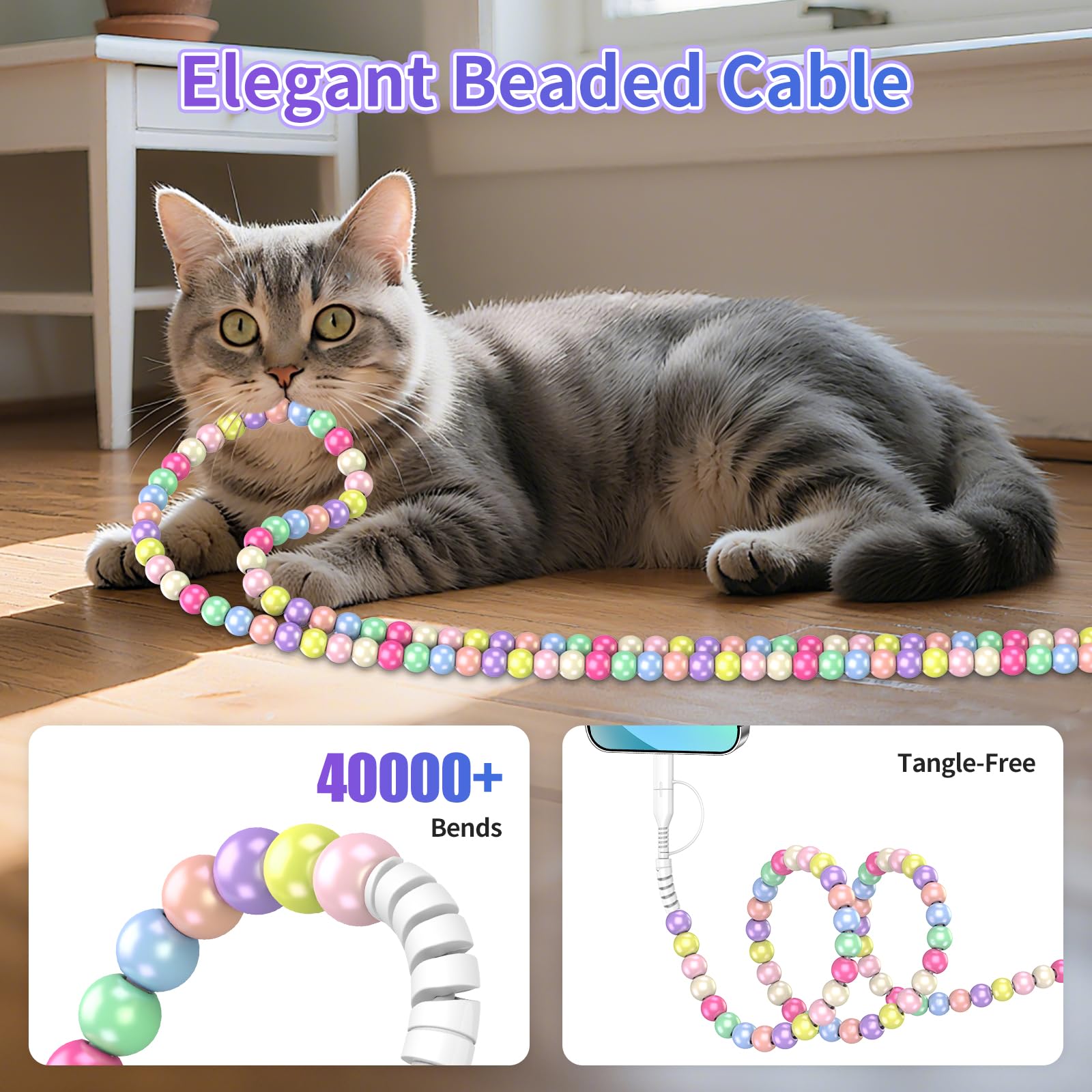 2-i-1 Perlebelagt Telefonladerkabel USB-A til USB-C til Telefon Hurtiglading Datasynkronisering Beskyttelse mot kjæledyrbiting Telefonladere Perle