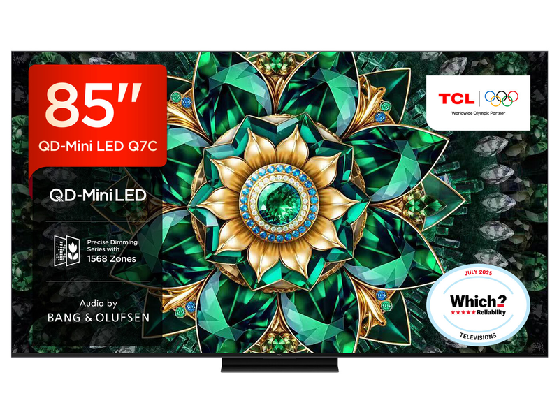 TCL 85Q7C-UK 85” QD-Mini LED TV, 4K UHD, Smart Google TV with 144Hz Motion Clarity Pro, Dolby Atmos, Audio by Bang & Olufsen, Game Master