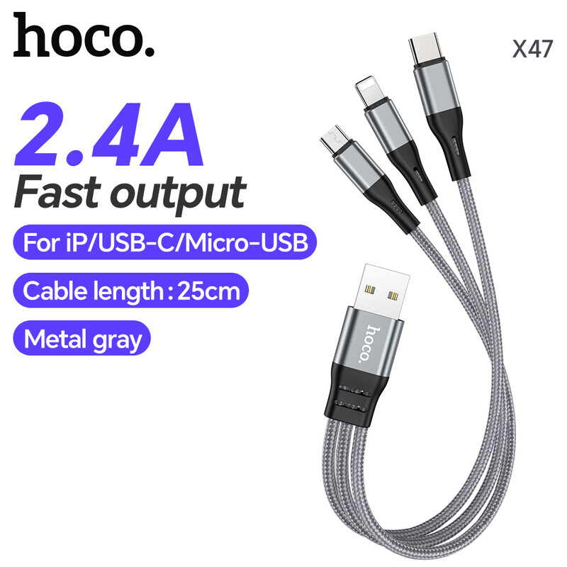 HOCO X47 3-in-1 Charging Cable Harbor - Lightning/ Micro-USB/ USB-C - 0.25M - Grey