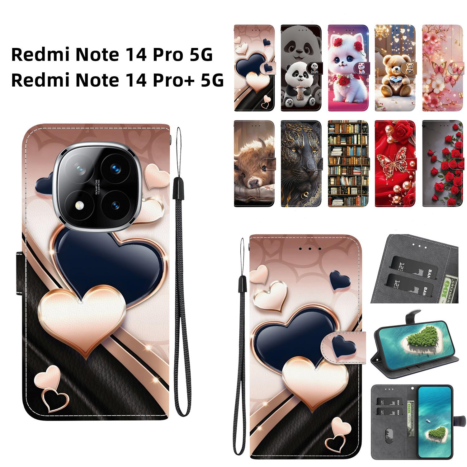 Handgefertigte PU-Leder-Flip-Hülle für Redmi Note 14 Pro 5G/ Note 14 Pro+ 5G Rutschfeste Stoßfeste Hülle mit Handschlaufe & Herz/Rose Katze Designs bl