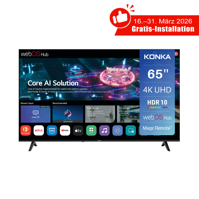 Konka 65 Zoll (164 cm) Smart TV - 4K UHD DLED, webOS TV, MEMC, HDR10, Dolby Audio, WLAN, Bluetooth, HDMI eARC, Google Cast & Airplay, Magic Remote & ThinQ AI-Sprachassistent, AI Sound, LG Channels, Tuner DVB-T/T2/C/S/S2, Gratis-Installation - UDG65HK684ANTS