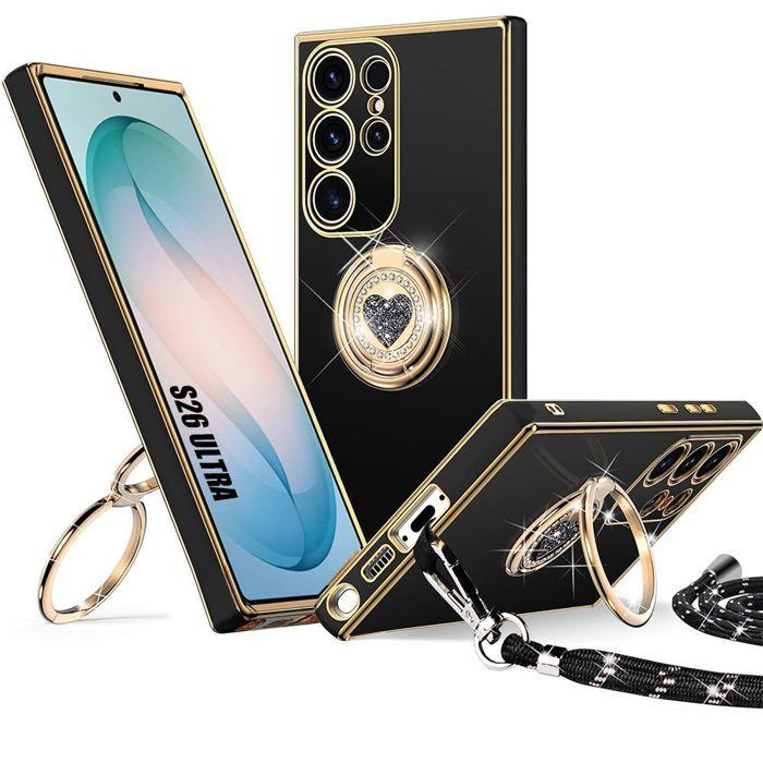 Fodral för Samsung Galaxy S26 Ultra, Silikon med Snöre och Roterbar Ring Mönster Hjärta - Svart svart