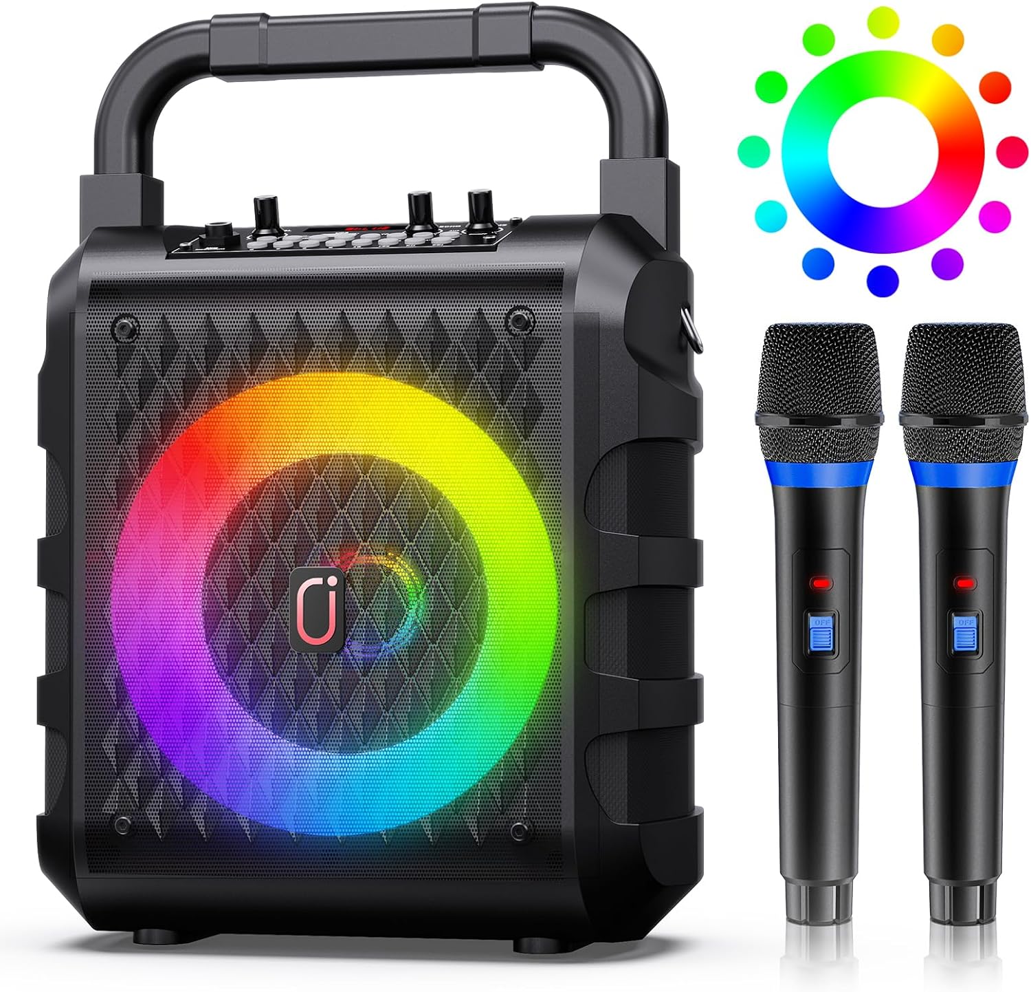 Karaoke-kasse med 2 trådløse mikrofoner, Profesjonell bærbar Bluetooth-karaoke med LED-lys, Eco/TF/USB, AUX for fester og voksne
