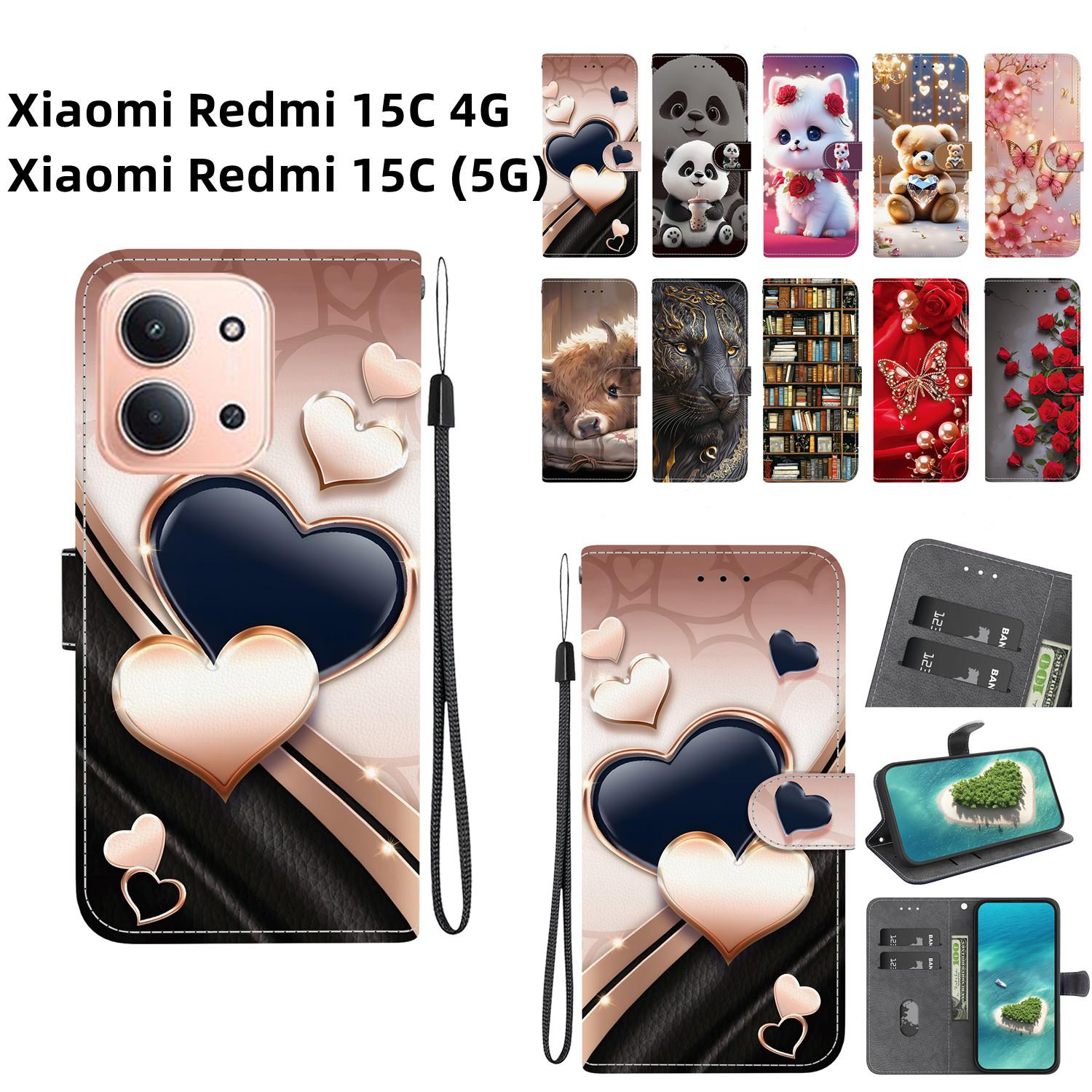 Handgefertigte PU-Leder-Flip-Hülle für Xiaomi Redmi 15C (4G/5G) Rutschfeste Stoßfeste Hülle mit Handschlaufe & Herz/Rose Katze Designs braun