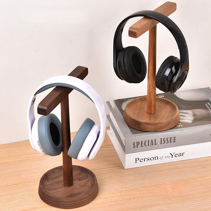 Solid Wood Dual Headphones Holder Black Walnut/Acacia Wood head-Mounted Headset Stand Hanger Desktop Bracket with Storage Base