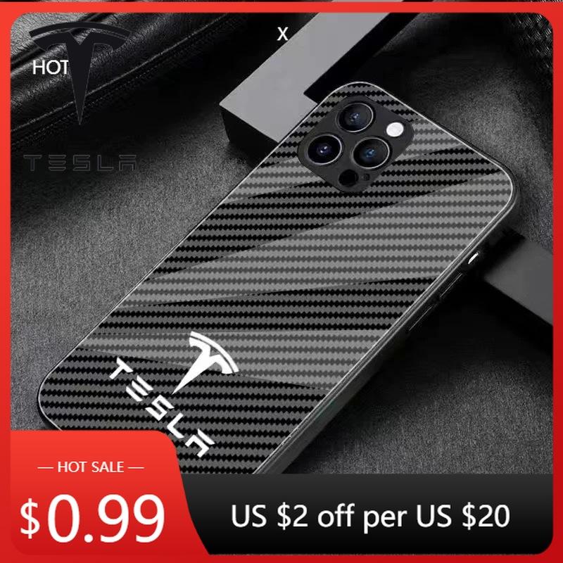 Bilklistremerke Tesla karbonfibermønster til Tesla telefondeksel til iPhone 16 Pro 11 12 Mini 13 14 Pro 15 Pro Max 7 8 Plus XR XS MAX Rød