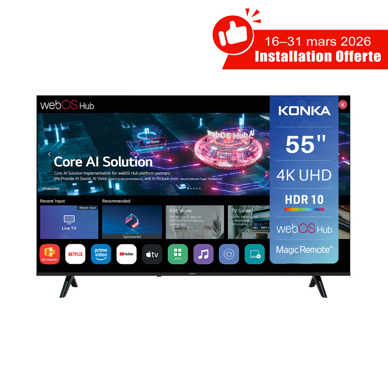 KONKA UDG55HK684ANTS Téléviseur 55 pouces 4K Ultra HD, système d’exploitation webOS, HDR10, MEMC, Magic Remote et contrôle vocal ThinQ IA, Airplay et Google Cast, WiFi, Bluetooth, HDMI eARC et installation gratuite