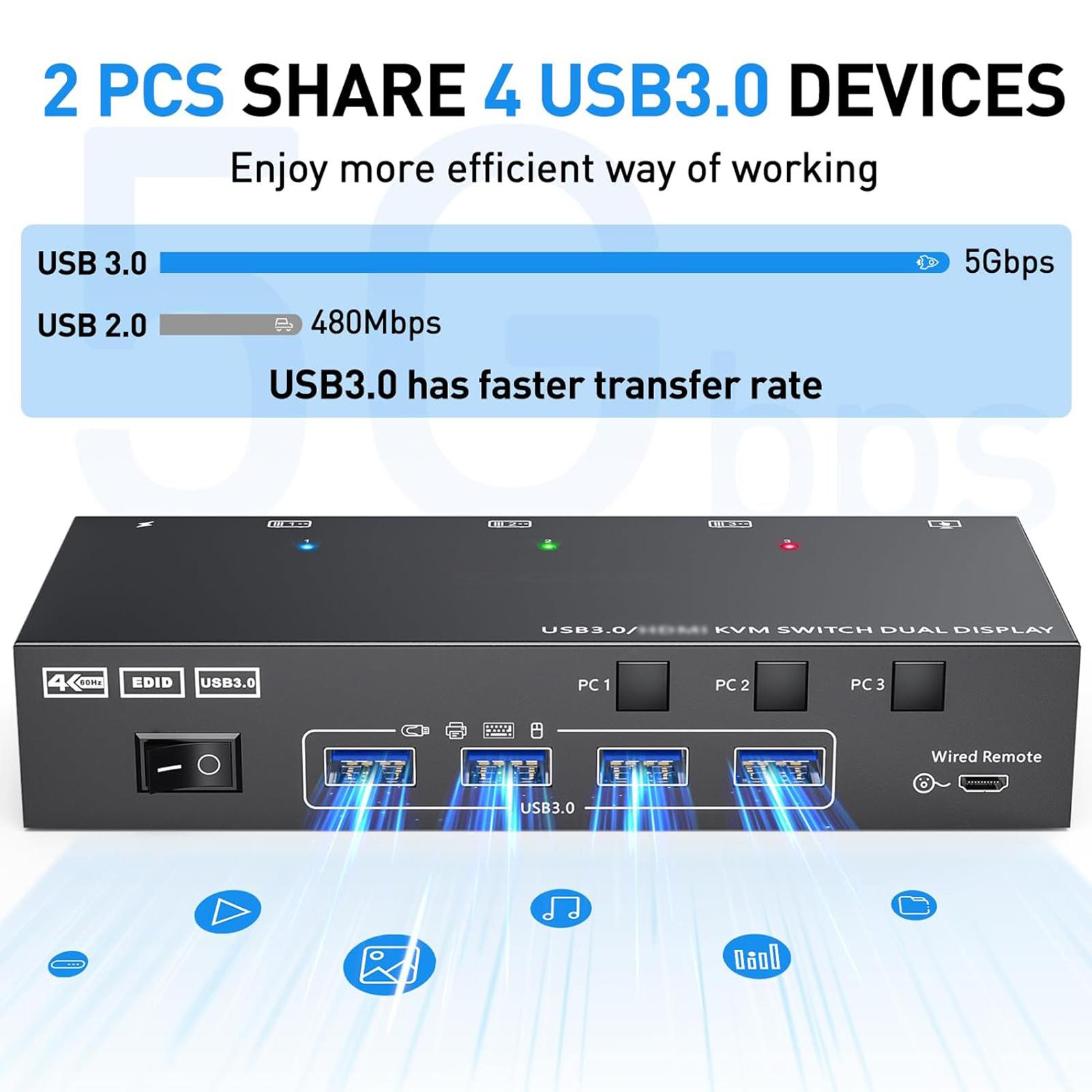 KVM med dobbel skjerm USB 3.0 -kompatibel KVM 2 skjermer 3 PC-er 4K@60Hz 2K@144Hz, EDID-emulator, KVM med dobbel skjerm med 4 USB 3.0 Po