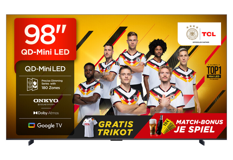 TCL 98T8C 98 Zoll QLED 4K HDR Ultra HD Fernseher, Smart TV mithilfe von Google TV (Dolby Vision Atmos, 144Hz Motion Clarity Pro, Game Bar, ALLM, FreeSync, Onkyo 2.1 Sound,Sprachsteuerung)
