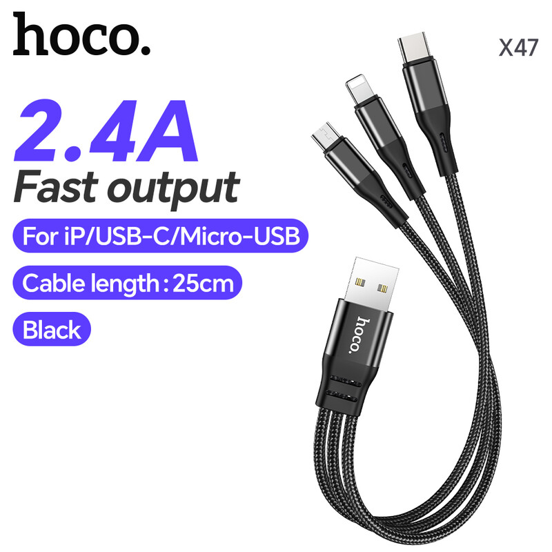 HOCO X47 3-in-1 Charging Cable Harbor - Lightning/ Micro-USB/ USB-C- 2.4A - 0.25M - Black
