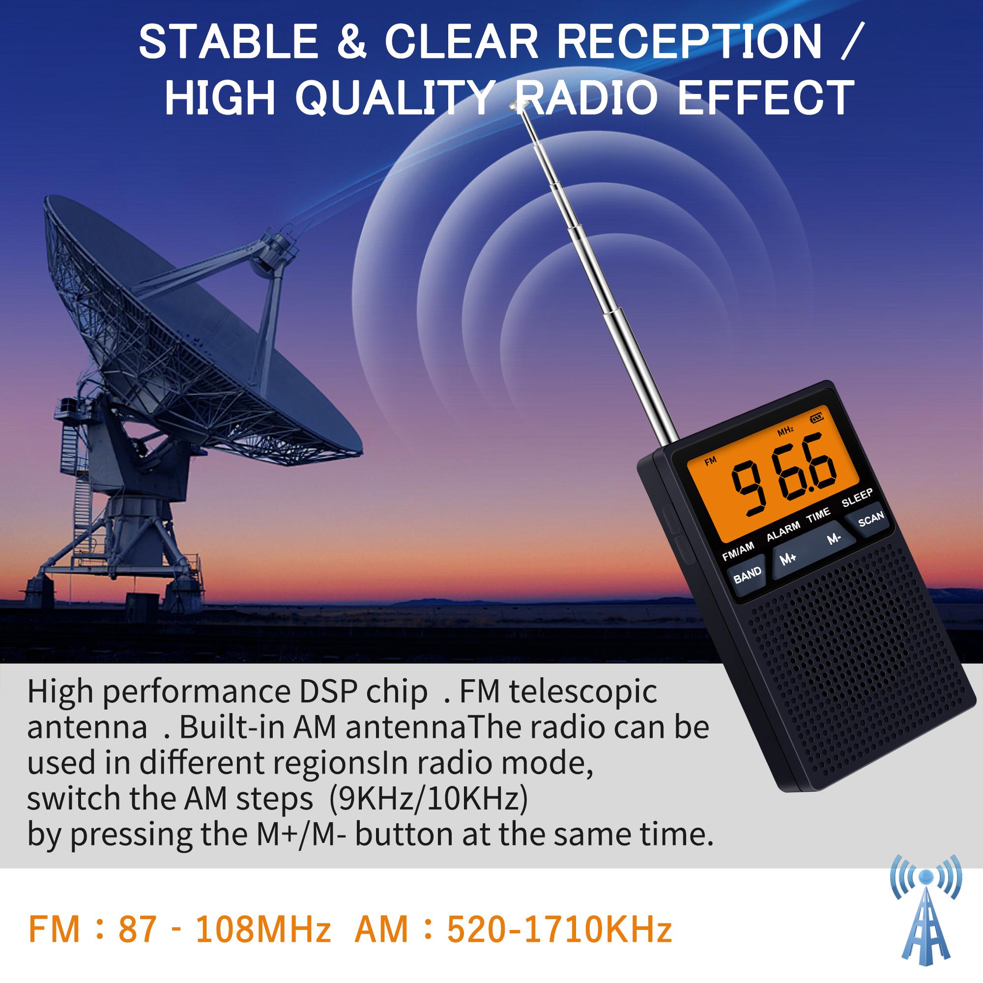 Mini Bærbar FM AM Radio LCD-skjerm Radiomottaker Innebygd Høyttaler Vekkeklokke med 3,5 mm Øretelefonstøtte Sovetimer Svart