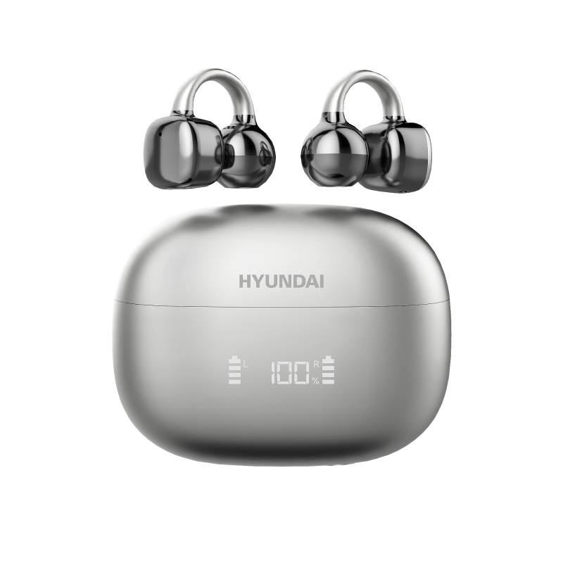 HYUNDAI Clipbuds7 Silberne Bluetooth-Ohrhörer Clip-On-Design Digitale Batterieanzeige Hochwertiger Klangkabelloses Headset mit Ohrclip Silber