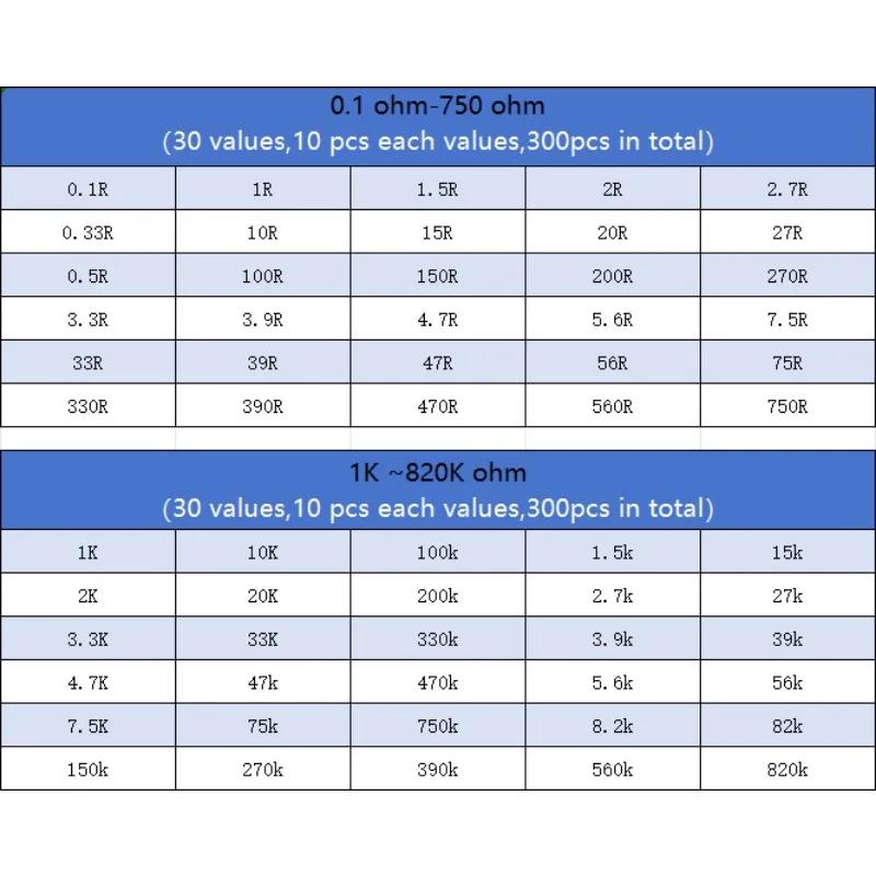 300 stk 5 % 1 W Motstandsett 30 Verdier X 10 stk Karbonfilm Motstander Sett 0,1~750 Ohm, 1K ~ 820K Ohm Motstand