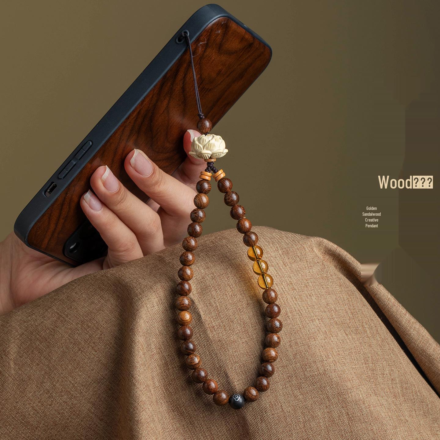 Złote drzewo sandałowe i żółty kryształowy koralikowy pasek na nadgarstek do telefonu – elegancki smycz dla kobiet