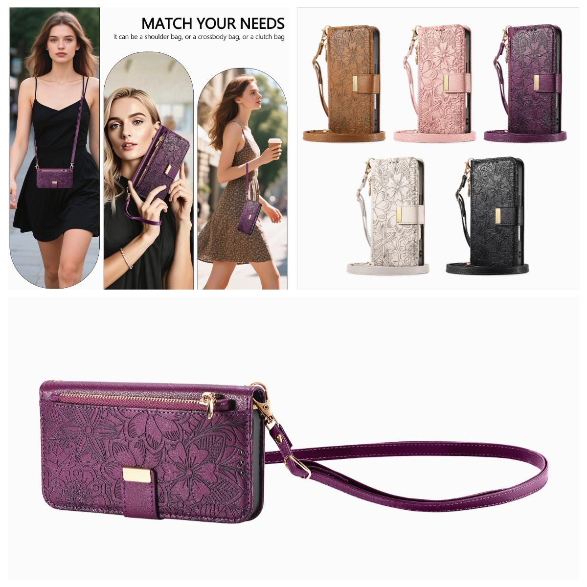 Bloemen Leren Portemonnee Hoes voor iPhone 12-17 serie. met Afneembare Schouderriem roze