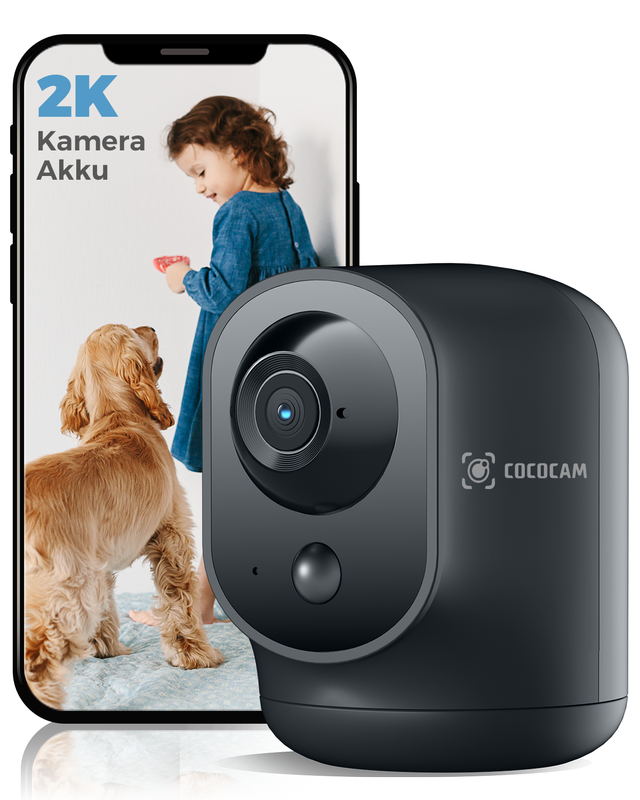 COCOCAM 2K Indoor-Sicherheitskamera mit Schwenk-/Neigefunktion, mit 5200‑mAh‑Akku, WLAN-Kamera, kabellos, für Babyphone/Haustier/Heimsicherheit, KI-Erkennung, PIR‑Menscherkennung, 2,4‑GHz‑WLAN (Schwarz)