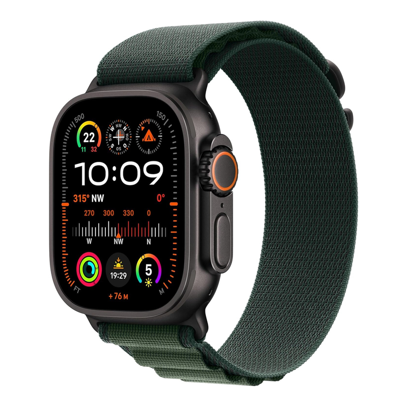Apple Watch Ultra 2 (GPS + Cellular, 49 mm) Smartwatch Sportuhr mit schwarzem Titangehäuse und Alpine Loop in Dunkelgrün (Größe S) – Fitnesstracker mit präzisem GPS, Action Button und CO₂-Neutralität