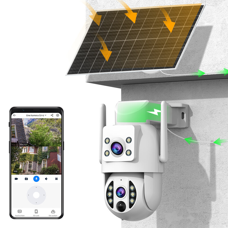 JOOAN Solarkameras Drahtlos im Freien für die Sicherheit zu Hause, 2K-Doppelobjektiv-WiFi-Kamera 360 ° Ansicht 9000 mAh batteriebetrieben PIR Human Detect Alarmalarmaufzeichnung, Scheinwerferfarbe Nacht, Cloud / Kartenaufzeichnung