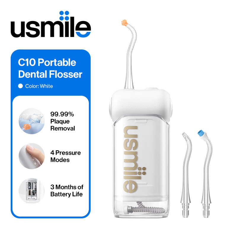 Usmile C10 Hydropulseur portable, autonomie de 95 jours, 4 modes, Buse 360°, réservoir 180 ml, IPX7 étanche - Blanc
