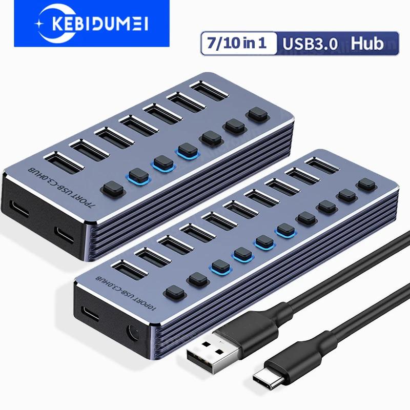 7/10-portars USB-hubb USB 3.0-dockningsstation med oberoende strömbrytare 12V-nätadapter LED-indikator för stationär PC Laptop USB-portar-förlängare