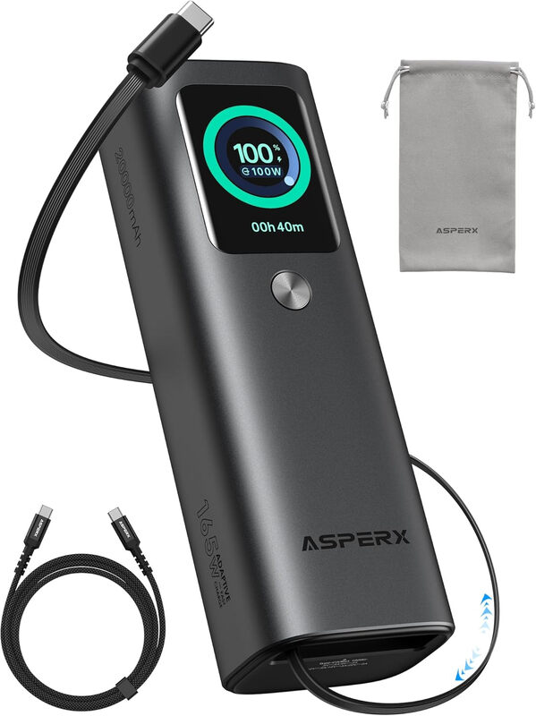 AsperX Laptop Power Bank, 165W 20,000mAh, Retractable Cables, Aluminum Alloy Unibody Portable Charger Power Bank, Battery Bank for MacBook Pro/Air/iPhone 17/iPad Pro/S25 Ultra/Dell/HP(TSA-Approved)