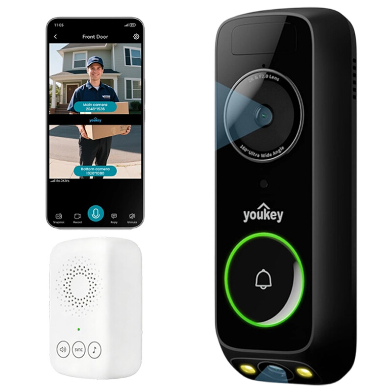 UNIVIEW Youkey DB312 Sonnette vidéo sans fil avec double caméra et campanille intégrée, vision nocturne en couleur 2K, batterie 6400 mAh, WiFi-6 2,4/5 GHz, détection radar + PIR, protection livraison, détection colis/personne/mouvement, appel bidirectionnel, stockage eMMC intégré 8 Go, sans frais mensuels