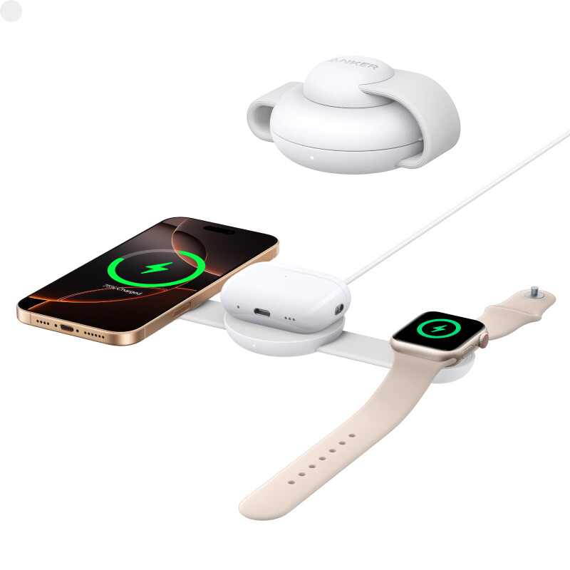 Anker MagGo Station de recharge sans fil 3 en 1, compatible MagSafe, certifié Qi2, 15 W, pliable, pour iPhone, AirPods et Apple Watch, chargeur USB-C inclus