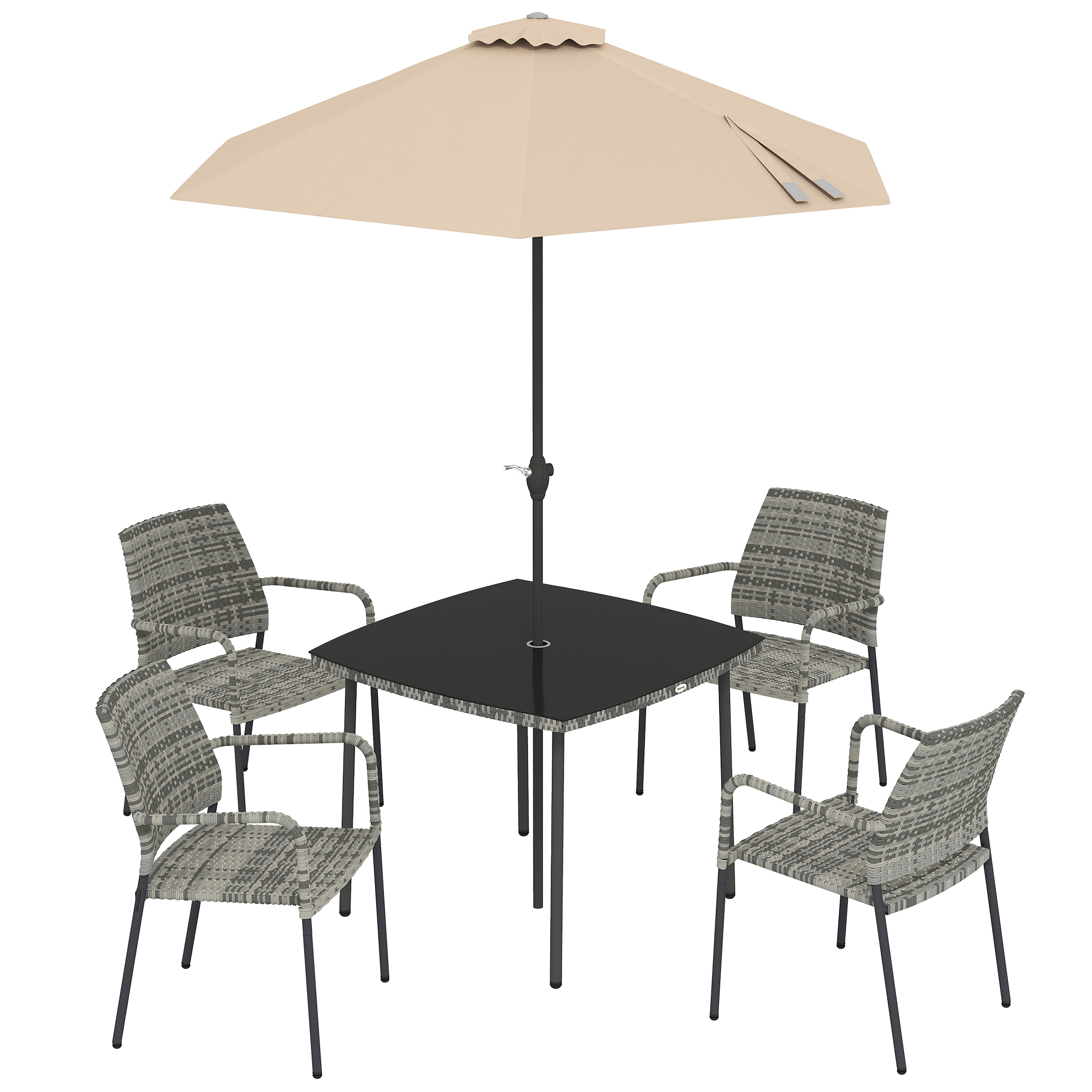 Outsunny 4 Seater Rattan Dining Set with Parasol, 6 Piece Garden Table and Stackable Chairs with Tempered Glass Tabletop