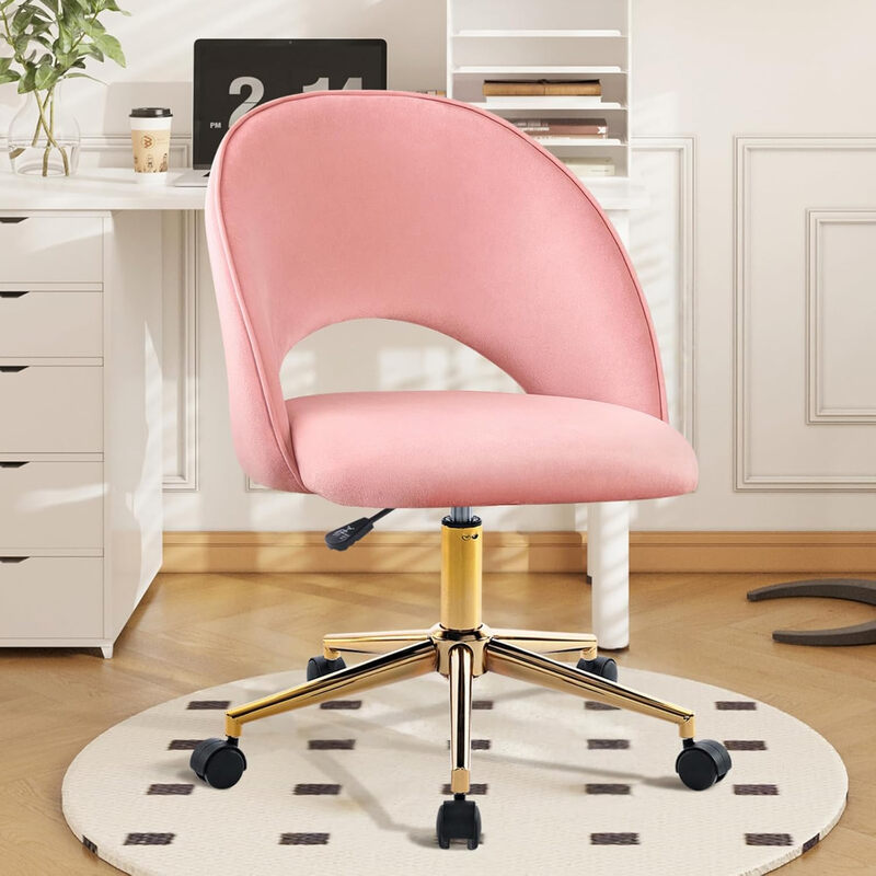 Hellove Chaise de coiffeuse réglable pivotante à roulettes avec cadre métallique doré et hauteur réglable - Velours rose
