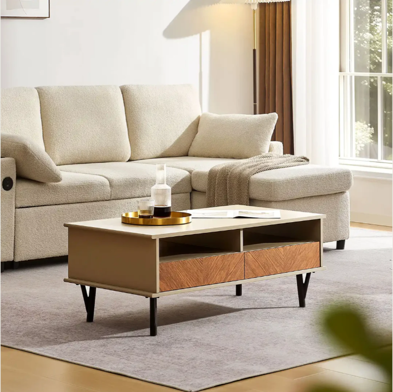 CLIPOP Coffee Table with 2 Drawers and Open Storage, Nature-Inspired Design Walnut & Sand Beige