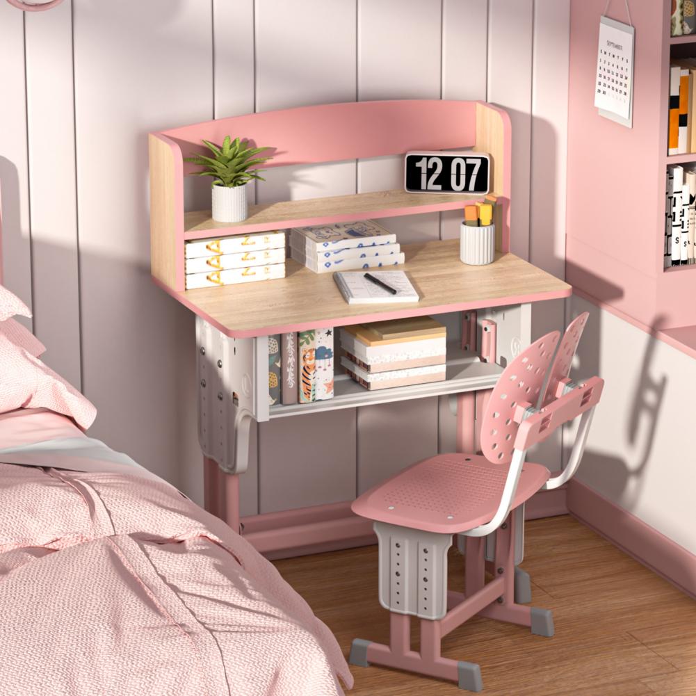 2-delt skrivebordsstolsett for barn – Høydejusterbart lærebord med skuff, bokstøtte, koppholder og kroker for barn Blå