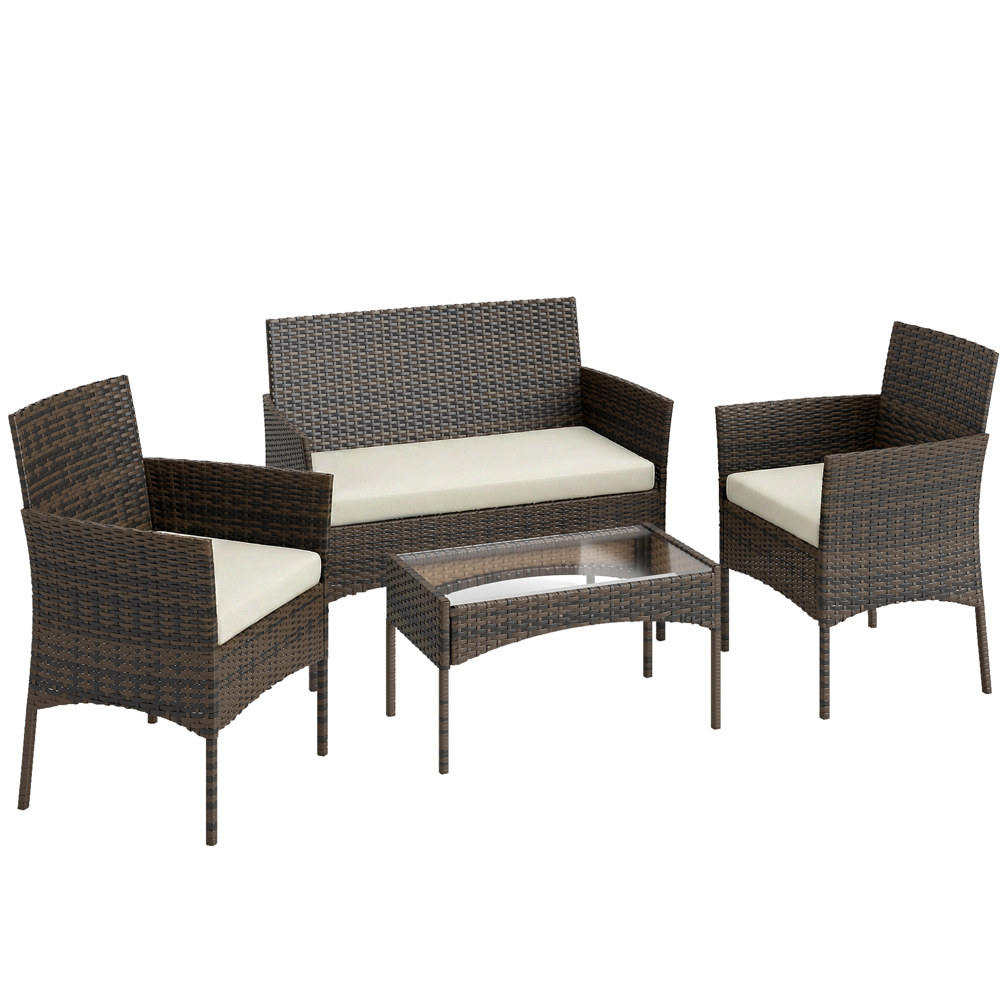 Outsunny 4 Piece Rattan Garden Furniture Sofa Set with Loveseat, Armchairs, Glass-Top Coffee Table and Cushions, Brown