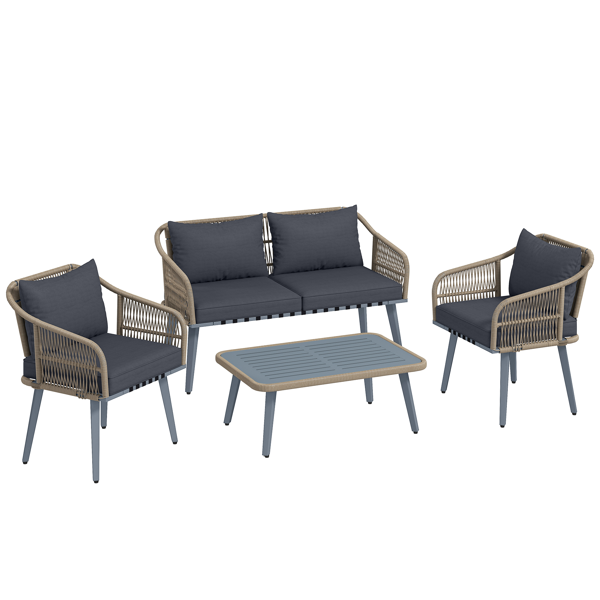 Outsunny 4 Seater Rattan Garden Furniture Set with 2 Armchairs, Loveseat, Coffee Table, Garden Sofa Set with Cushions, Dark Grey