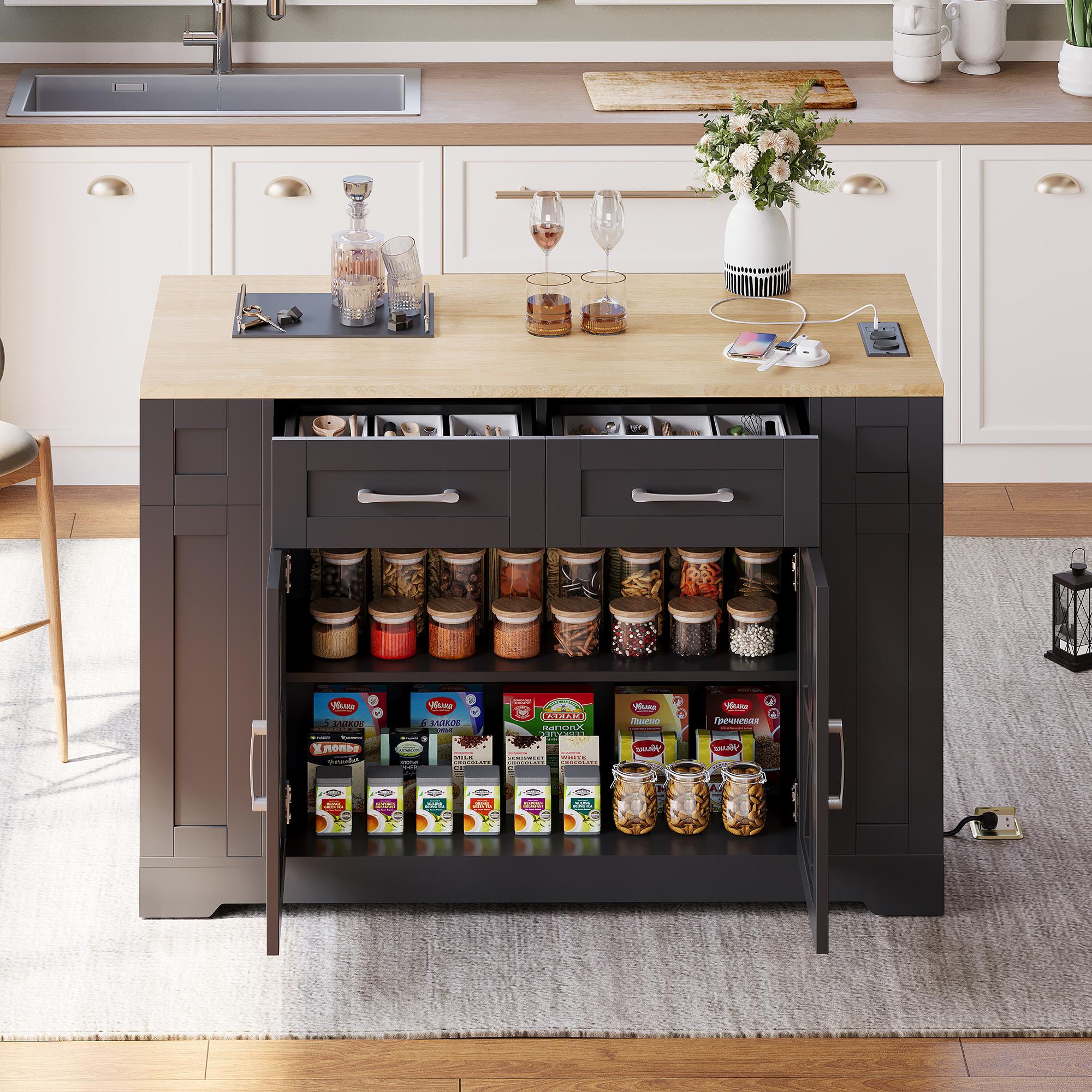 HOMCOM Kitchen Island with Spice Rack, Kitchen Storage with Large Tabletop for 4 People, Adjustable Shelves Black & Natural
