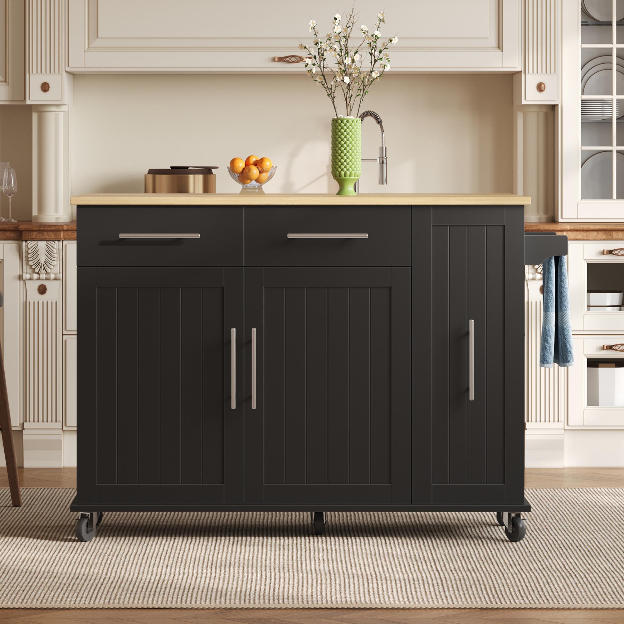 Versatile Kitchen Island with 3 Drawers and 2‑Door Cupboards, Practical Trolley with Extendable Worktop, 132L x 70W x 87H cm, Natural+Black | Aosom UK