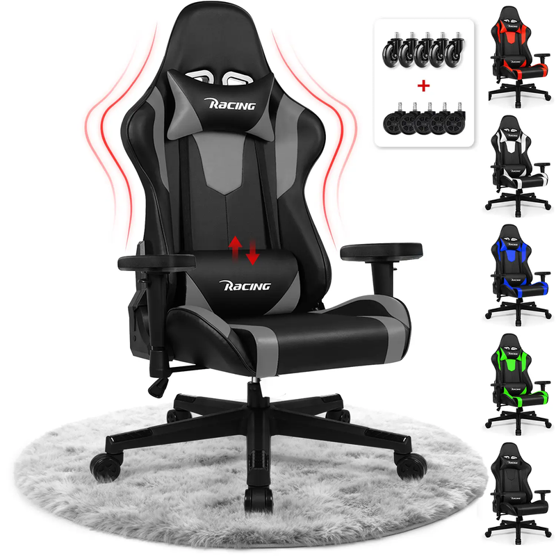 Gaming-Stuhl, ergonomischer Bürostuhl mit verstellbarem Lendenkissen, Kopfstütze und Armlehnen, gepolsterter Gaming-Stuhl, Gamer-Stuhl mit Wippfunktion, Gaming-Stuhl mit 150 kg Tragfähigkeit, grau