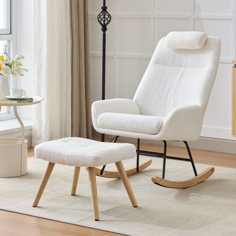 Teddy Samt Schaukelstuhl, Sessel in weißer Optik, Gummibaumbeine, Spritzguss-Eisenrahmen, Wohnzimmersessel, Schlafzimmersessel mit Kopfstütze Fußstütze