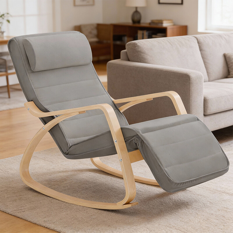 SoBuy Schaukelstuhl mit Polster, Schaukelsessel mit Kopfstütze und Verstellbarer Fußstütze, relaxsessel - Grau