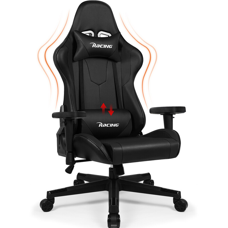 Gaming-Stuhl, ergonomischer Bürostuhl mit verstellbarem Lendenkissen, Kopfstütze und Armlehnen, gepolsterter Gaming-Stuhl, Gamer-Stuhl mit Wippfunktion, Gaming-Stuhl mit 150 kg Tragkraft, schwarz