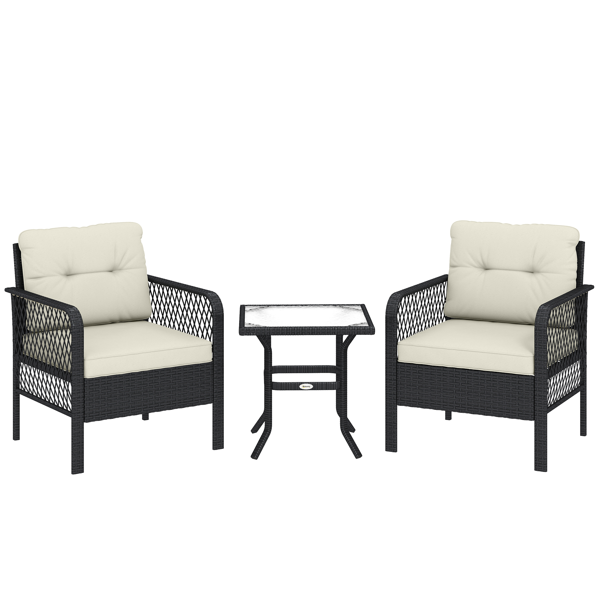 Outsunny 3 Pieces Rattan Bistro Set with Glass Top Coffee Table, Chairs and Cushions for Outdoor, Patio, Balcony, Cream