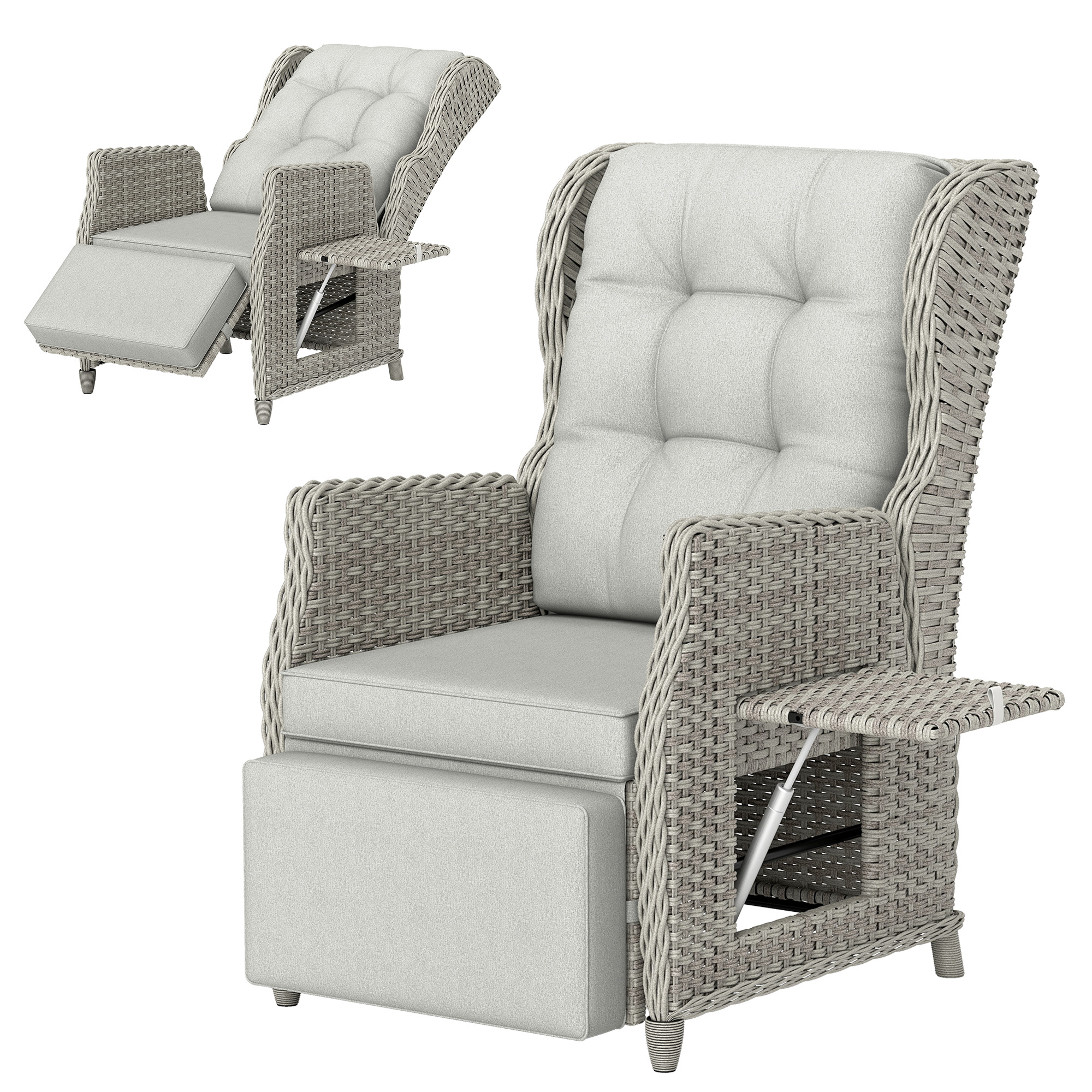Outsunny Rattan Bistro Set, Reclining Garden Chairs and Glass Coffee Table with Cushions for Patio Balcony Porch, Light Grey