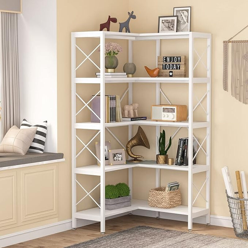 Tribesigns 5-stöckiges Eck-Bücherregal, Aufbewahrungs- und Ausstellungsregal mit Metallrahmen für Wohnzimmer und Home Office, Weiß